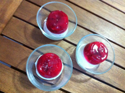 Mousse de morango com surpresa de fruta (foi ao frio para ficar com efeito gelado), mais frutas frescas e um toque de chocolate derretido para os mais gulosos.